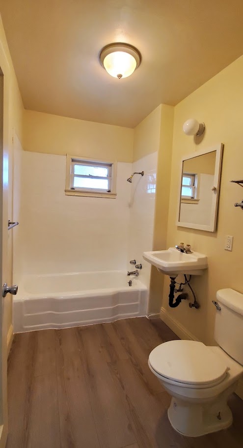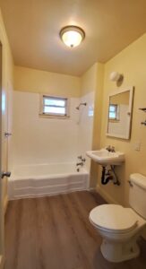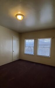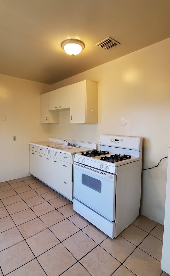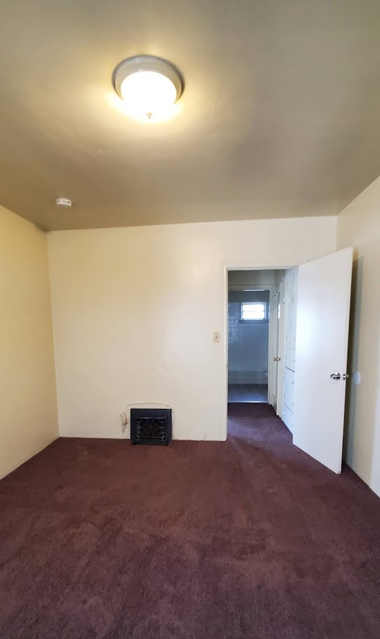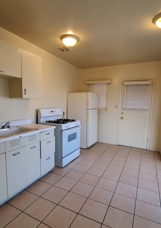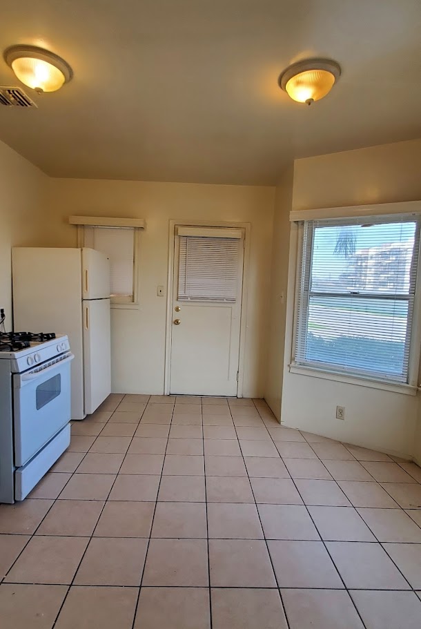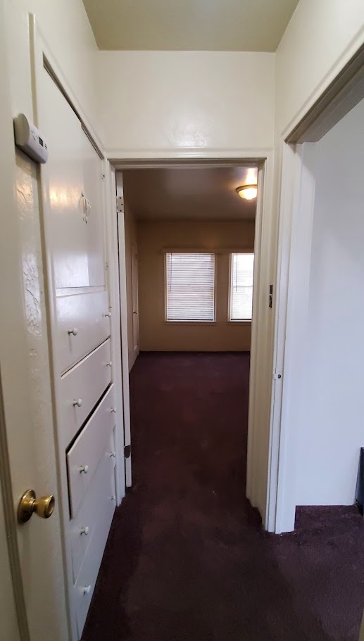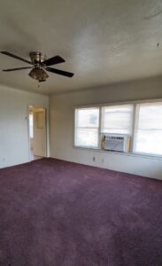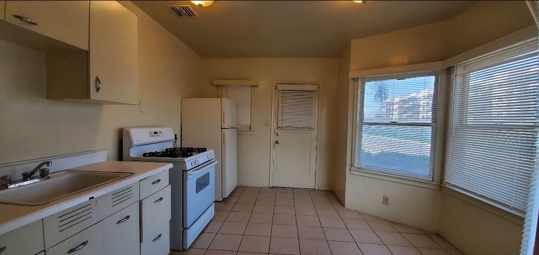 One-bedroom, one-bathroom apartment with washer/dryer hookups. Kitchen includes stove and refrigerator. Features wall heaters and window AC units. One-car garage.