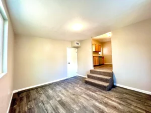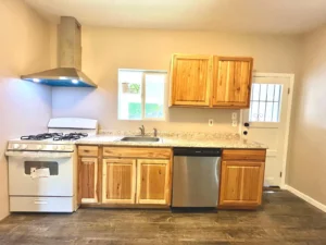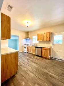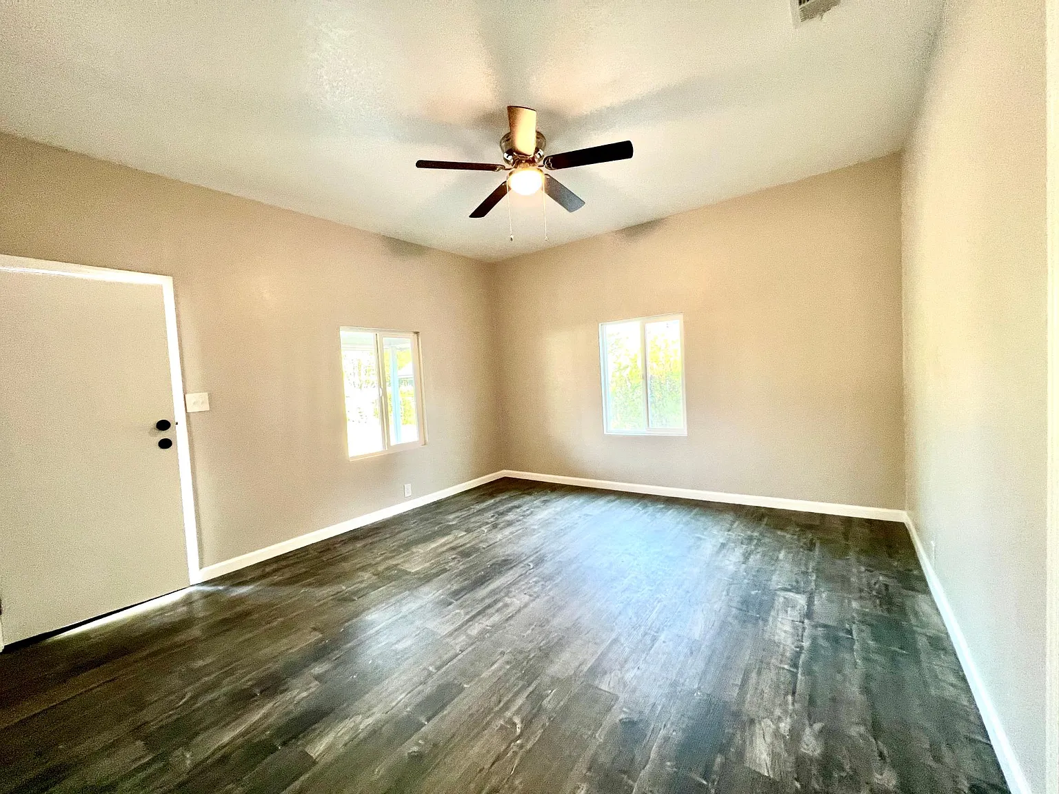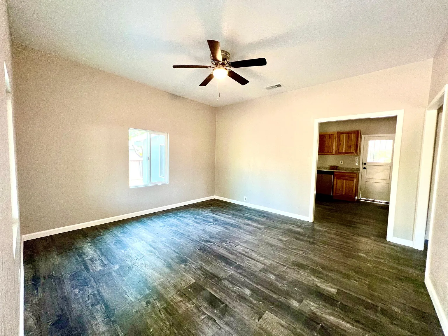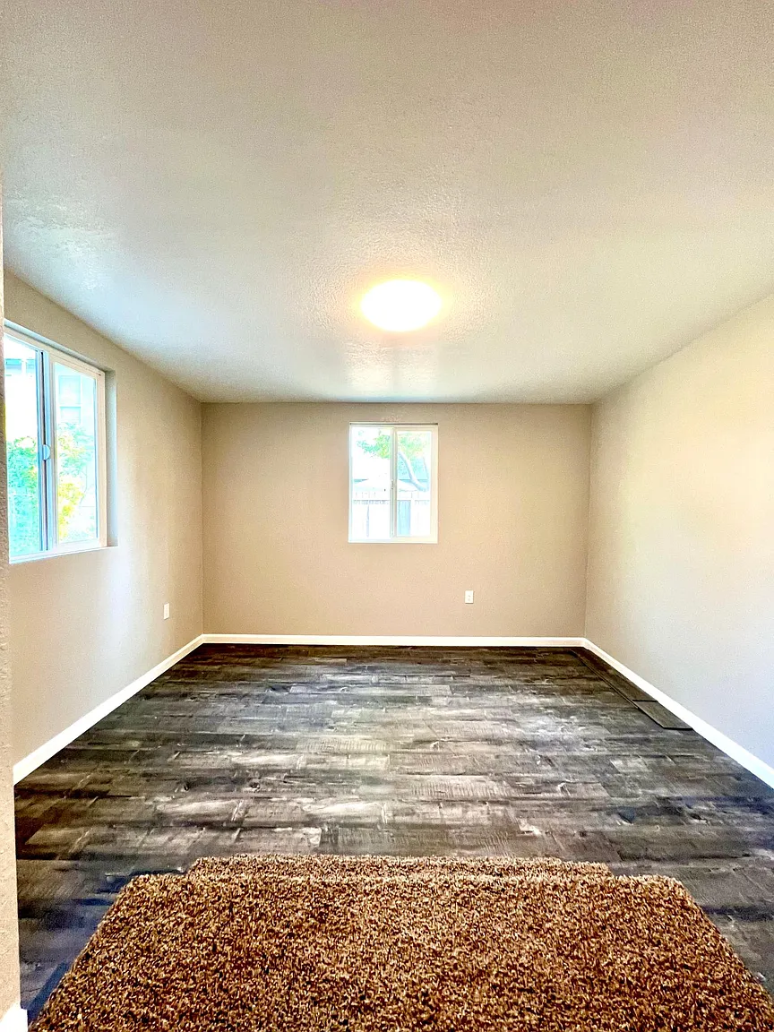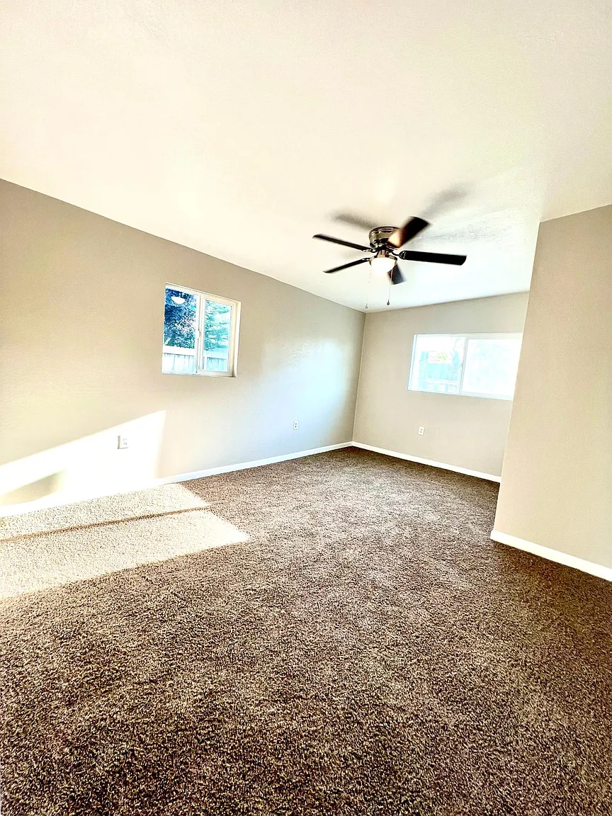 Family home in Clovis, three bedrooms, one bathroom. Features central air and heat, a kitchen with a gas stove and refrigerator. Located off Barstow and Sunnyside. The house has carpet and LVT/Laminate flooring.